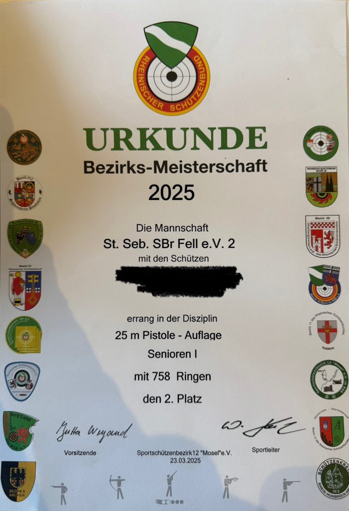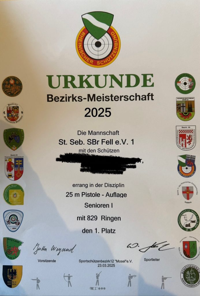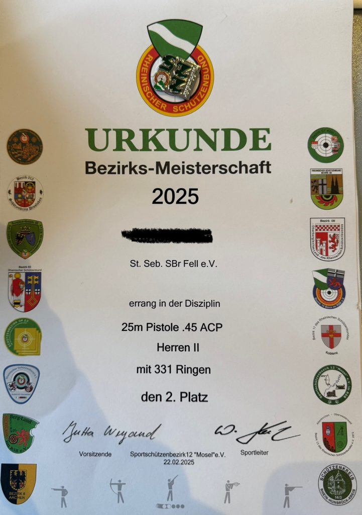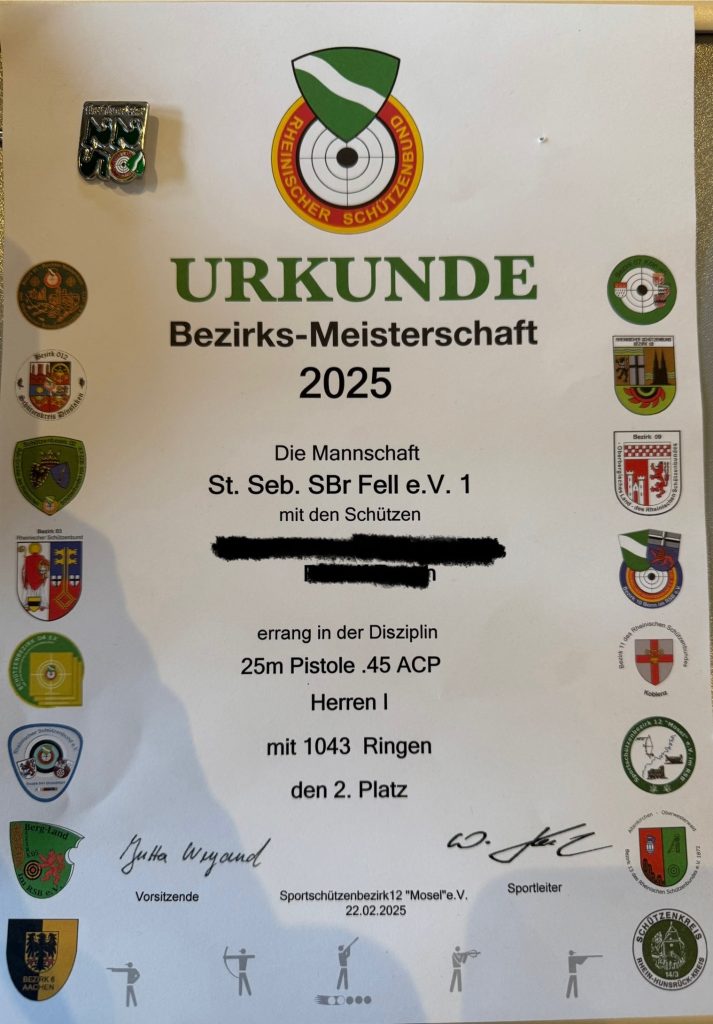 sowie Platz 4 als Mannschaftsergebnis 25m Pistole beidhändig.